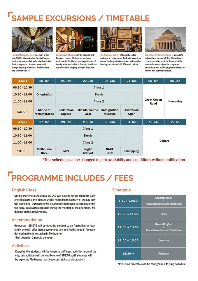 - Hoạt động ý nghĩa: Mỗi ngày, học sinh sẽ được khám phá các hoạt động khác nhau trong thành phố, các hoạt động này sẽ được hướng dẫn bởi một giáo viên của SMEAG, cùng nhân viên trợ lý chương trình, học sinh sẽ được khám phá các điểm tham quan và thử thách hoạt động nhóm thú vị nhất, mang đậm bản sắc văn hóa ở Melbourne.
