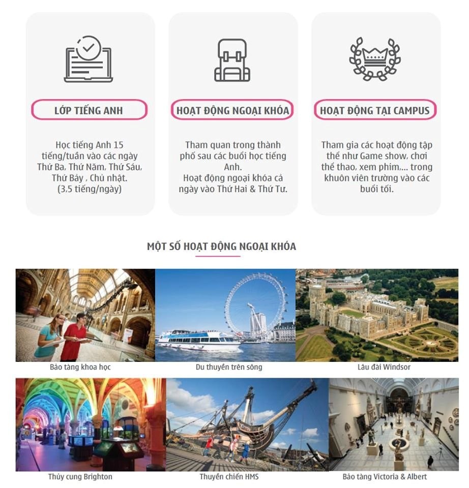 – Hoạt động ngoại khóa phong phú sau mỗi giờ học, tham quan các địa điểm nổi tiếng, trải nghiệm thiên nhiên hoang dã … tại 2 điểm đến London và Brighton theo lịch trình đã chọn.