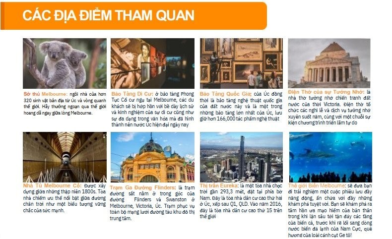– Hoạt động ngoại khóa phong phú sau mỗi giờ học, tham quan các địa điểm nổi tiếng, trải nghiệm thiên nhiên hoang dã … tại 2 điểm đến Sydney và Melbourne theo lịch trình đã chọn.