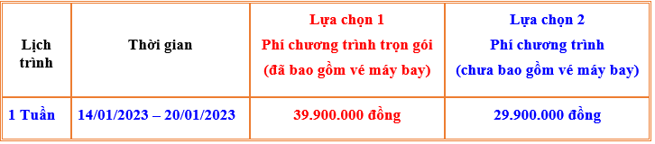 Chương trình khởi hành dự kiến từ ngày 14/01/2023 – 20/01/2023 (tức từ ngày 23 – 29/12 âm lịch)