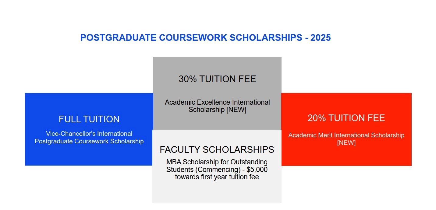 - Học bổng 100% học phí – Vice-Chancellor’s International Postgraduate Coursework Scholarship;