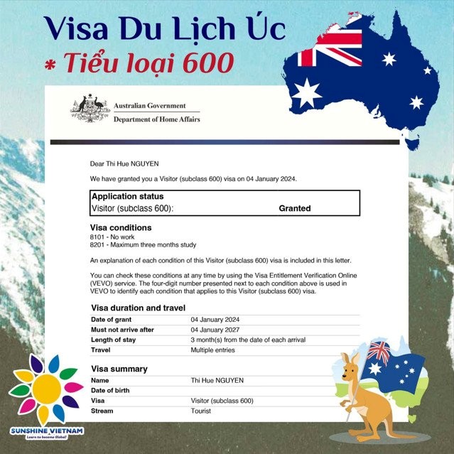 Năm 2019 và 2022, Sunshine Vietnam đã 2 lần hỗ trợ anh chị xin Visa du lịch/thăm thân Úc thành công, mỗi lần Visa được cấp với thời hạn 1 năm, đi lại nhiều lần, mỗi lần không quá 3 tháng