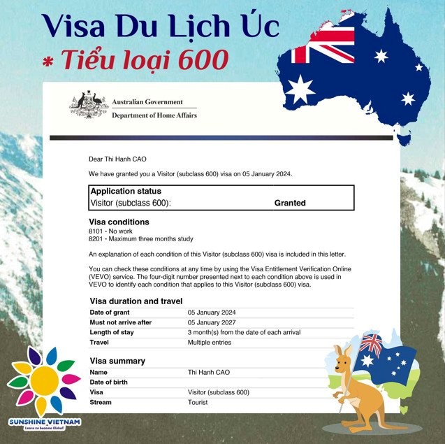 Với sự tư vấn và hỗ trợ nhiệt tình, chuyên nghiệp và tận tâm của Team Sunshine Vietnam, anh chị đã nhanh chóng được cấp Visa du lịch Úc, chỉ sau 5 ngày tính từ lúc nộp hồ sơ và chỉ sau 2 ngày tính từ lúc làm xong sinh trắc học. Đặc biệt, mặc dù đây mới là lần cấp Visa du lịch Úc đầu tiên, nhưng cả hai anh chị đã thuận lợi có được tấm Visa du lịch với thời hạn lên tới 3 năm, được đi lại nhiều lần, mỗi lần không quá 3 tháng.